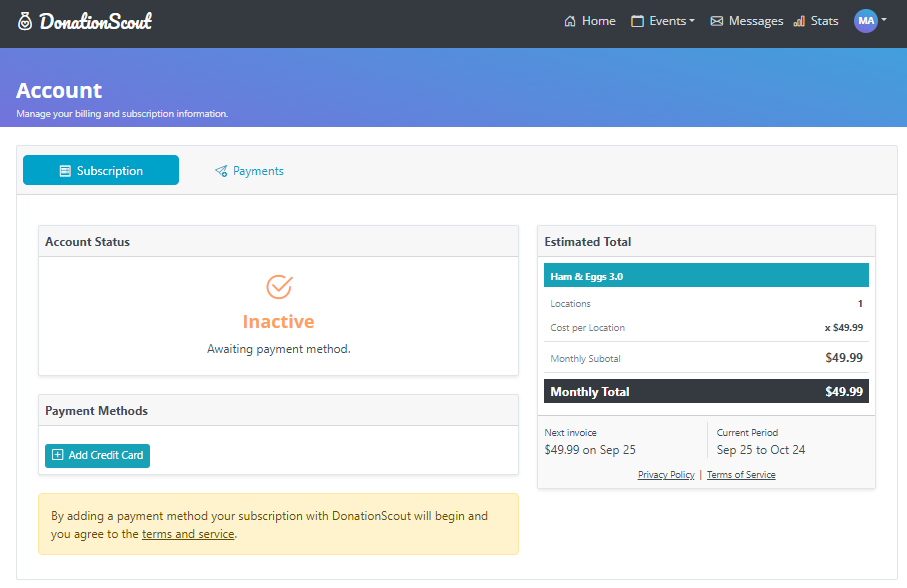 Account holders can pay the DonationScout monthly subscription via cedit card. To add a payment method, navigate to your Account page.