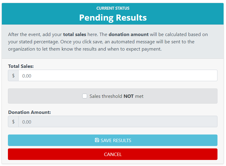 You may have past events that were cancelled, or changed, but not adjusted in DonationScout. These events will show up as Pending Results events. Once you’ve confirmed that the event never happened, simply hit the Cancel button at the bottom of the screen shown below. This is a best practice that will help you avoid confusion as you process other events.
