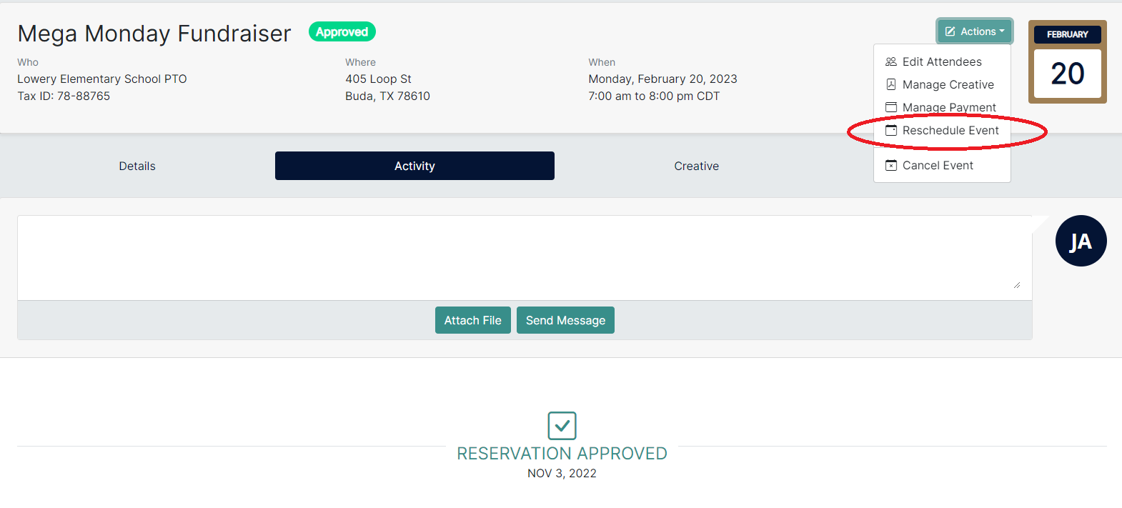 To reschedule or cancel your event, navigate to the Action dropdown at the top right of the reservation page as shown below. Select the new date and enter a reason for the change. You will receive an email with this update along with a revised calendar invitation.