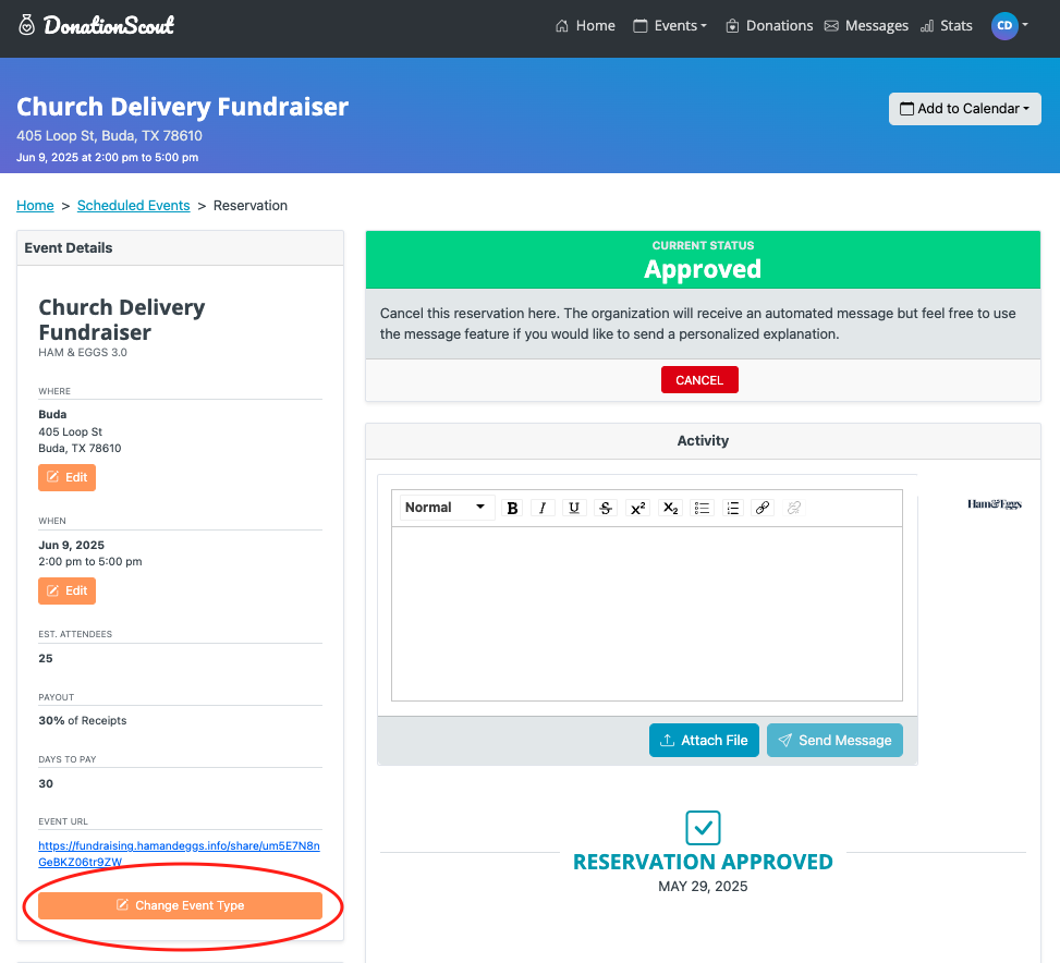 To do this, first navigate to the event you'd like to edit. Once you're on the event page, click "Change Event Type" under Event Details on the left-hand side.
